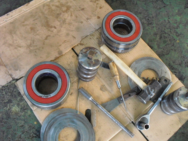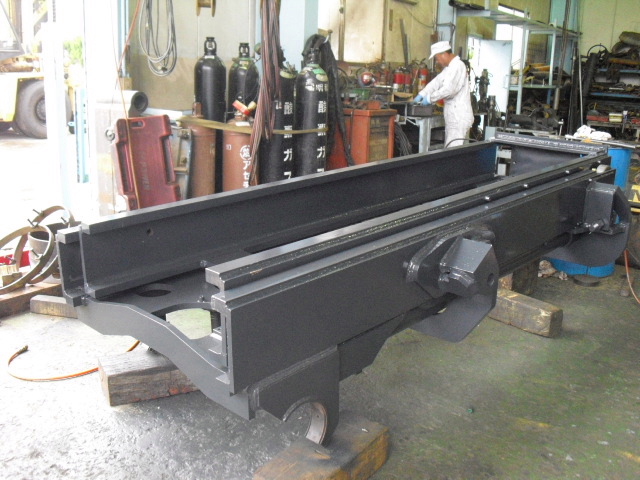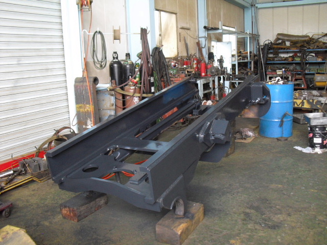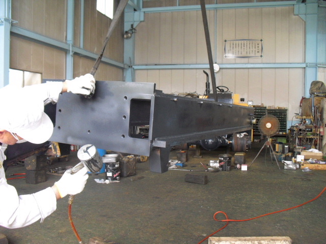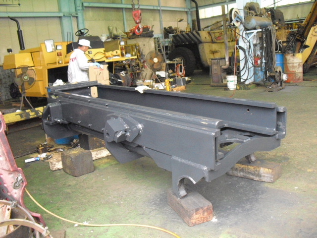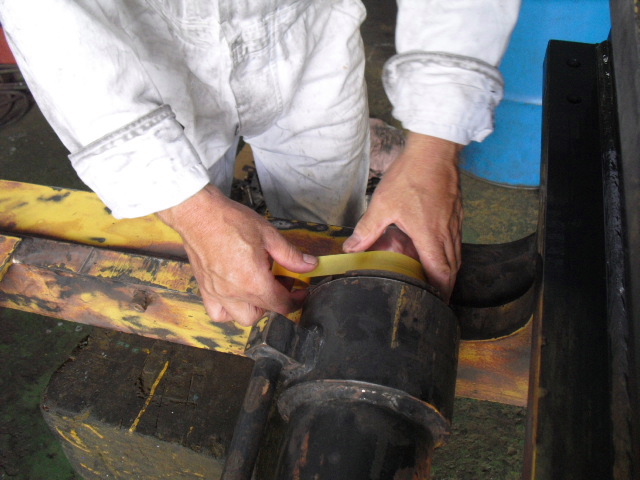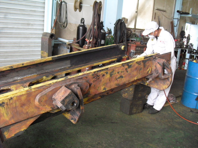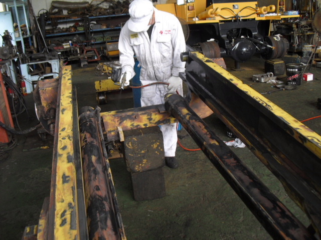 ◆中古11.5tフォークリフト マスト塗装編◆車両販売情報 / 2011年6月24日 2011年6月29日 マストの加工及び磨きが終わり塗装をします。 シリンダー露出部にマスキング!! 工場内 気温32度!!湿度むしむし!!状態での塗装だけど、艶消しだからOK 【危険!】写真では分かりませんが、マスト、真下での作業では有りません!! インナーとアウトマストを組み付けました。 エンドローラーとグリスアップ用配管の取り付け ホースプーリーも取りつけて、この車両はサイドシフト付です。 あとはブラケットを取りつけてボディーと合体です。