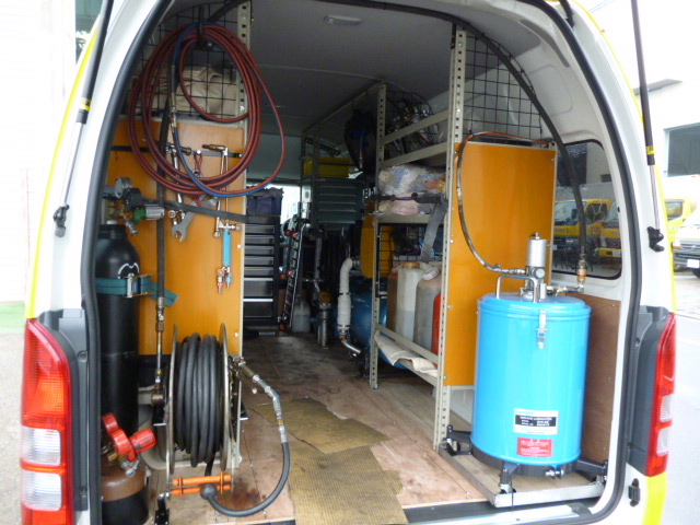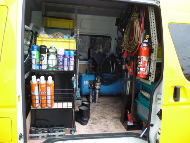 ◆土曜日ですが、営業中◆車両販売情報 / 2012年3月17日 2012年3月17日 雨の土曜日ですが、元気に営業中です。 連日UPして来ましたサービスカーの完結編です!! 拘りの棚だそうです↓↑ ホースリールには仕掛けが有るとか!! 小さいので充実とはいきませんが、軽作業なら十分ですね~ 贅沢、言えば高圧スチーム洗車機がほしいところです!! あと【つり道具とサマーベット】を積めばパーフェクト!! お清めをして7号車発進です!! 因みに今日は友引です。