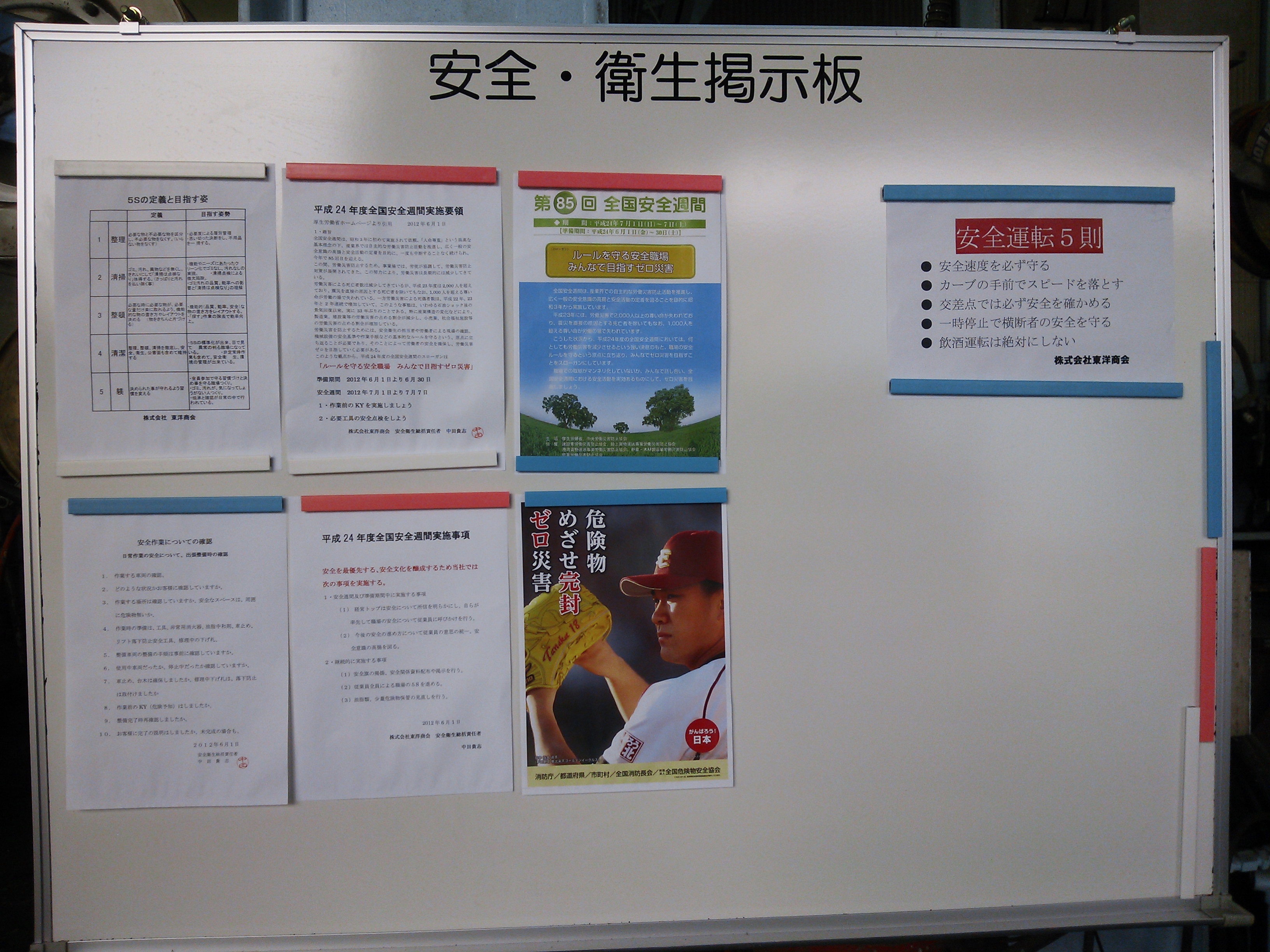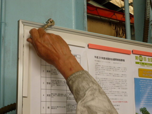 ◆全国安全週間◆車両販売情報 / 2012年6月1日 2012年6月1日 本日6月1日より全国安全週間の準備期間になります。 それに基づき昨日、当社工場内に初の【安全・衛生掲示板】を設置致しました。 設置指導役の顧問です。 「文字が小さい」とのクレームが有り拡大コピーします!! 全国安全は7月1日~7日迄です。