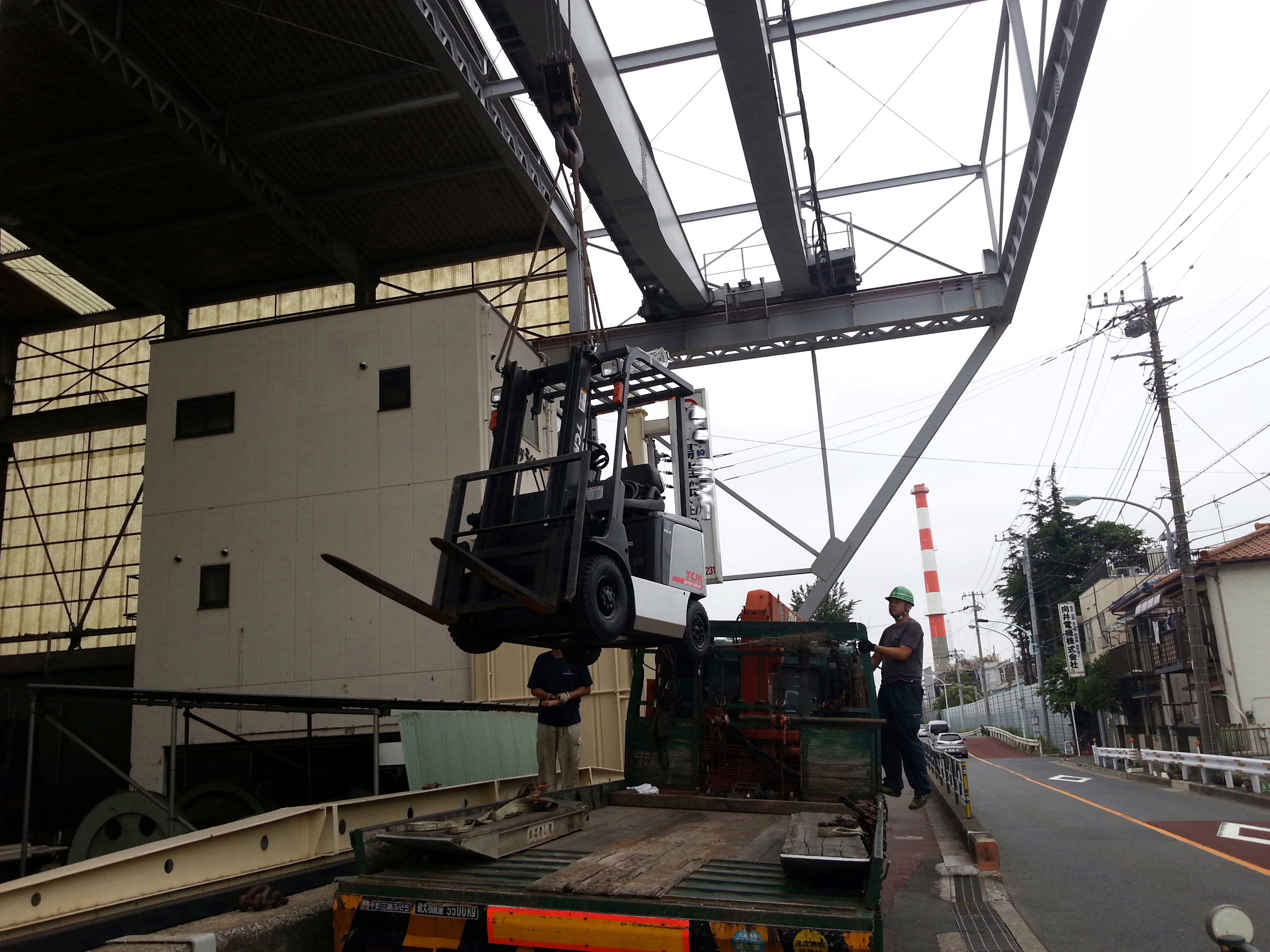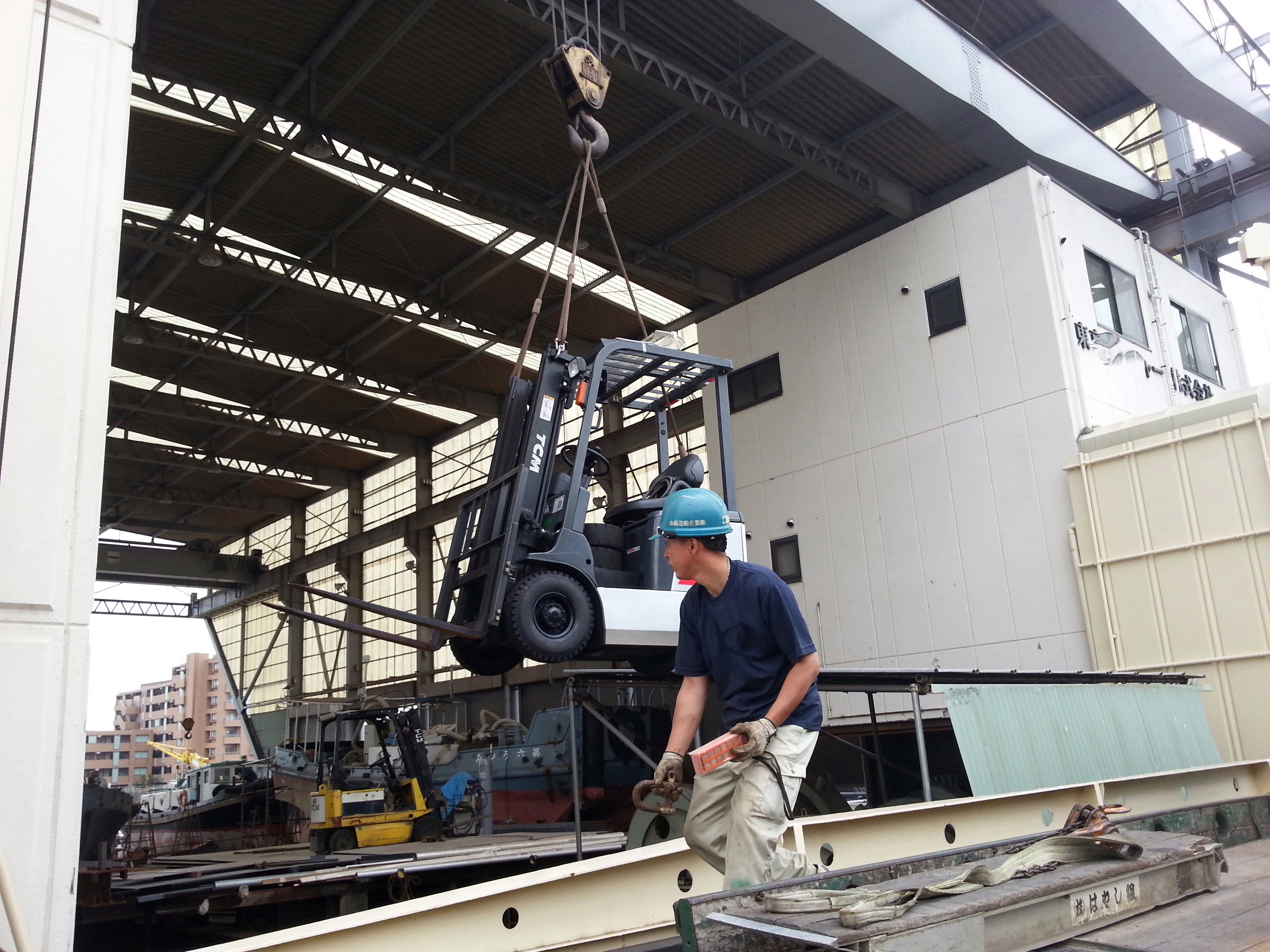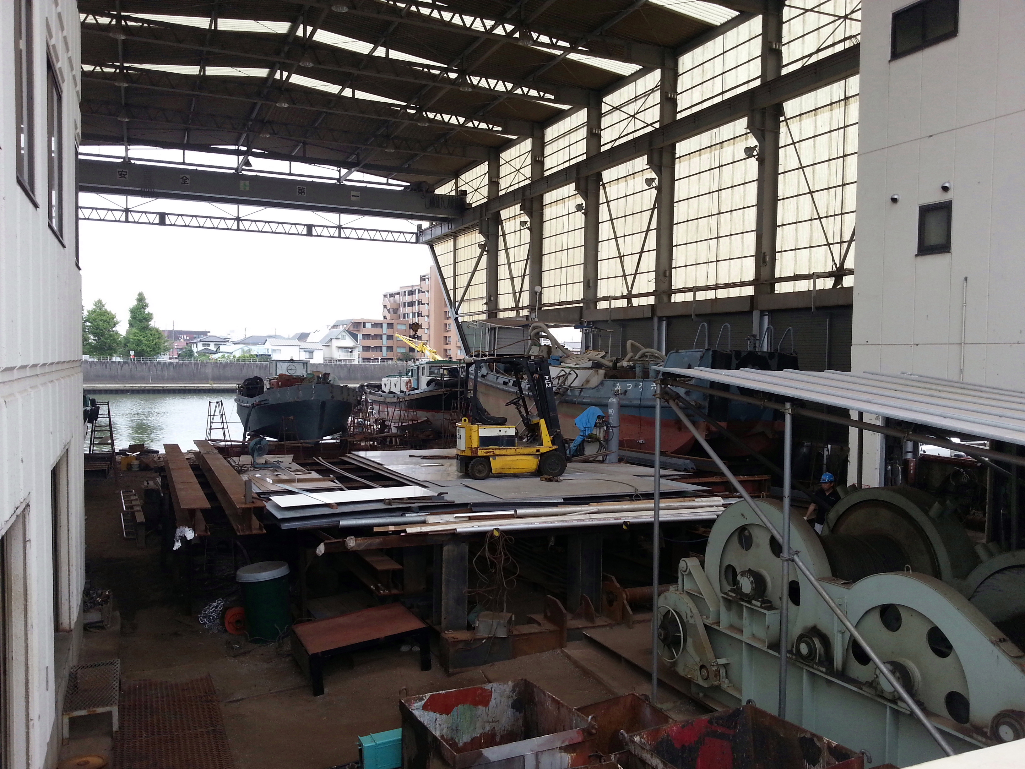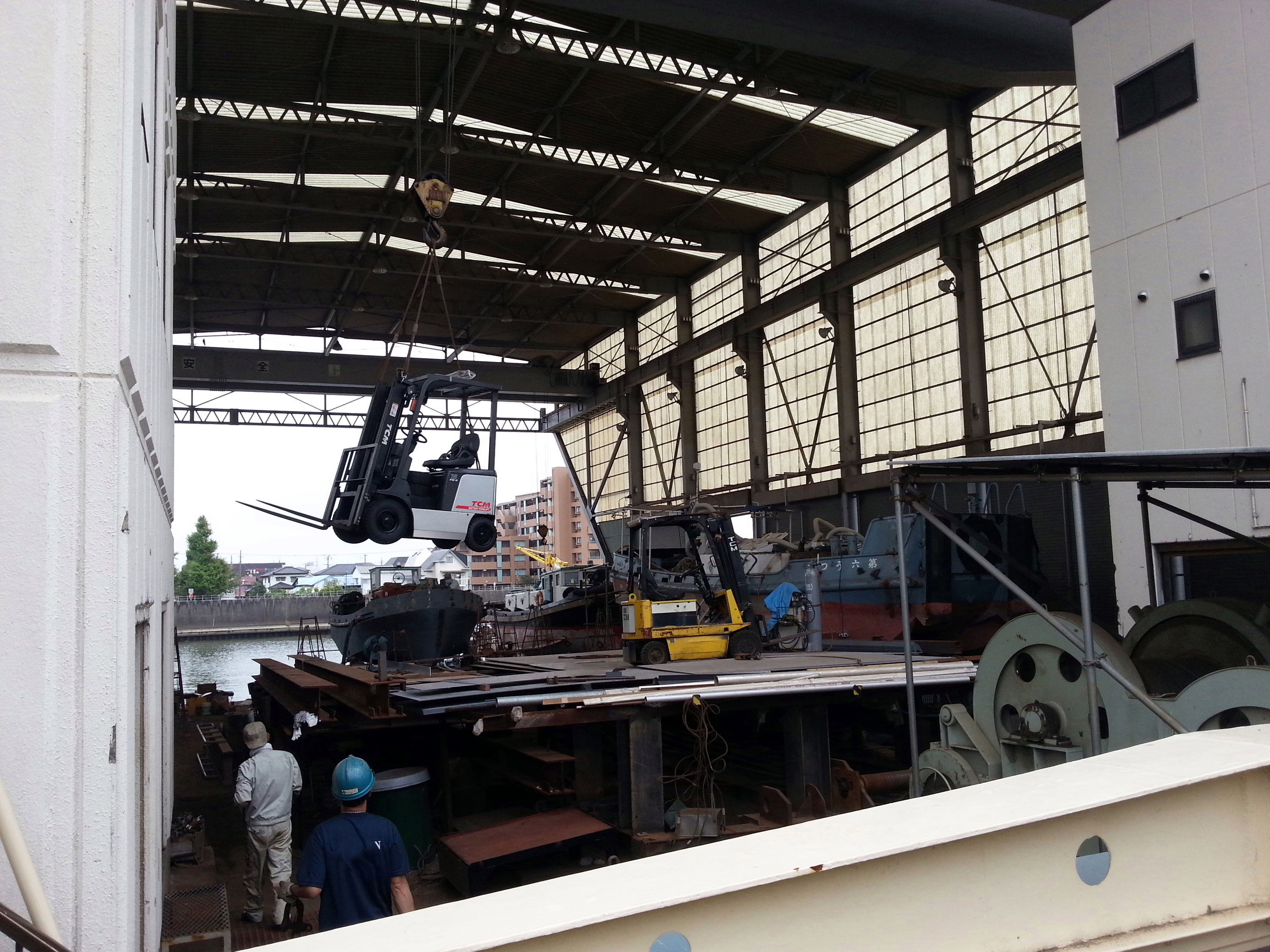 ◆バッテーリーフォーク納車◆車両販売情報 / 2012年7月20日 2012年7月20日 先日、TCM 1.5tバッテリーフォークを納車して来ました!! 走行して場内に入るのかと思いきや・・・道路まで迫り出した天井クレーンがお出迎え!! 使用するのが川側なので、そのまま奥へ 手前に下取り用のフォークが待機しています。 船の製造及び修理を見学するのは初めてなので、驚く事ばかりでした!! ありがとうございました