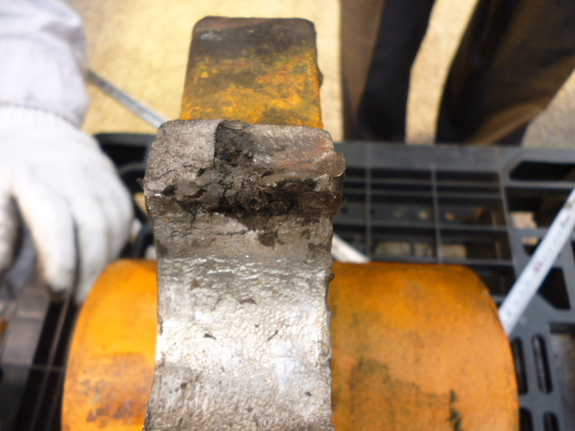 ◆TCM FD240 リヤナックルに異常事態!!◆車両販売情報 / 2012年9月14日 2012年9月14日 TCM FD240 24t車のリヤナックルがこの様な状態になってしまいました!! 以前から有ったと思われるキズ パワーシリンダーとの連結部です。 先月は18t車の逆パターンが有ったばかりですよ・・・(パワーシリンダー側の折損) 決してハードな現場ではないんですがね~ 使用状況の違う現場でこの様な事態が続くのは品質に問題が有るのでは? 現在も対策待ちの為24tフォークリフトは停止状態です!! お客様には多大なご迷惑をお掛けしています。