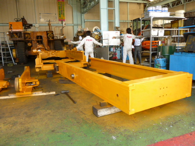 ◆TCM FD270 マスト組み立て◆車両販売情報 / 2012年9月14日 2012年9月14日 TCM FD270 マスト組み上がりました!! この年式のチェーンローラーは頑丈です。 1本シリンダーは、今となってはお宝・・・・ エンドローラーの交換しました。 ラジオ体操のスペースは明日から確保出来ます。 一応下塗りはしましたよ~ 天井クレーンも重そうです。 どうやら、来週あたりフォークリフトの形になりそうですね!! 随時レポートします。