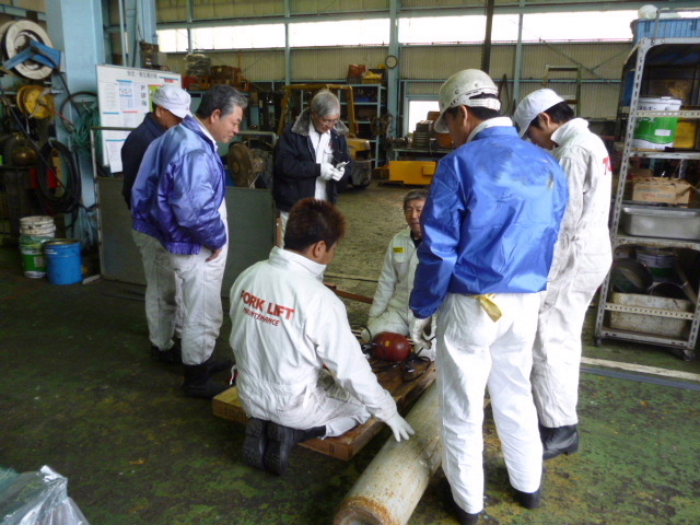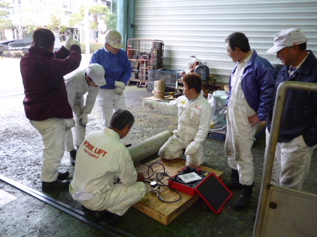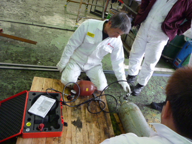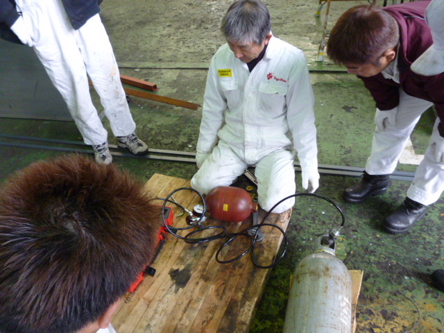 ◆窒素ガス・プチ講習会◆車両販売情報 / 2013年2月8日 2013年2月8日 寒い金曜日、朝から窒素ガス充てん講習会を開きました。 講師役は斎藤さんです。 アキュームレーターのガス充てんは、外注に頼っていました!! 今後は自社で行いますが、タンクの寿命が短いのが難点です。 ・・・・・